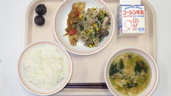 3日(金)ごはん いわしのピリカラフル ほうれん草とコーンのソテー(小松菜) かき玉汁 巨峰(2粒) 牛乳 ※いわしの日