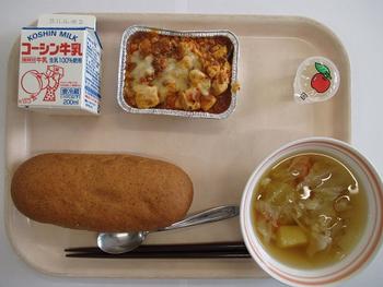 5日(水)胚芽パン 豆腐のミートグラタン きゃべつとじゃがいもの和風スープ 一口リンゴゼリー 牛乳