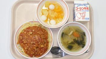 6日(木)スパゲッティミートソース(大豆) 野菜とお豆のスープ フルーツ白玉 牛乳