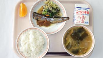 9日(火)ごはん さんまの甘露煮 のり和え 味噌汁(じゃが玉・若布・油揚・えのき) 国産ゆめオレンジ 牛乳