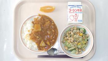 12日(金)チキンカレー ごぼうと大豆のパリパリサラダ 国産ゆめオレンジ 牛乳