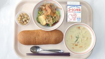 15日(月)胚芽パン かぼちゃのシチュー レンコンチップスサラダ ポップビーンズ 牛乳