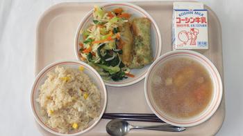 17日(水)コーンちゃめし ちくわの磯辺揚げ わかさぎのフリッター(1本) こぶ茶和え ごま仕立ての味噌汁 牛乳