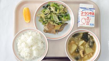 18日(木)ごはん さばのごま味噌煮ゆず風味 小松菜のごま和え 味噌汁(じゃが玉・若布・油揚・えのき) 国産ゆめオレンジ 牛乳