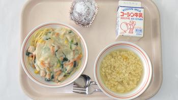 19日(金)鮭のクリームスパゲティ コーンたまごスープ チョコレートマフィン 牛乳