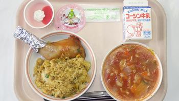 22日(月)カレーピラフ かごしまけんさんローストチキン かぼちゃいりミネストローネ クリスマスカップデザート 牛乳 ※クリスマス給食