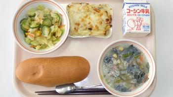 2日(月)胚芽パン マカロニチキングラタン コーンサラダ 和風ベジタブルスープ 牛乳