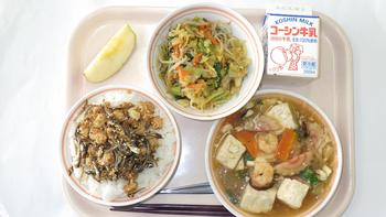 4日(水)ごはん じゃこと大豆のかりかり揚げ 海鮮豆腐 おかかあえ(糸けずり) りんご 牛乳