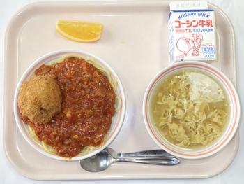 6日(金)ミートソーススパゲティ ライスコロッケ コーンたまごスープ 国産オレンジ 牛乳