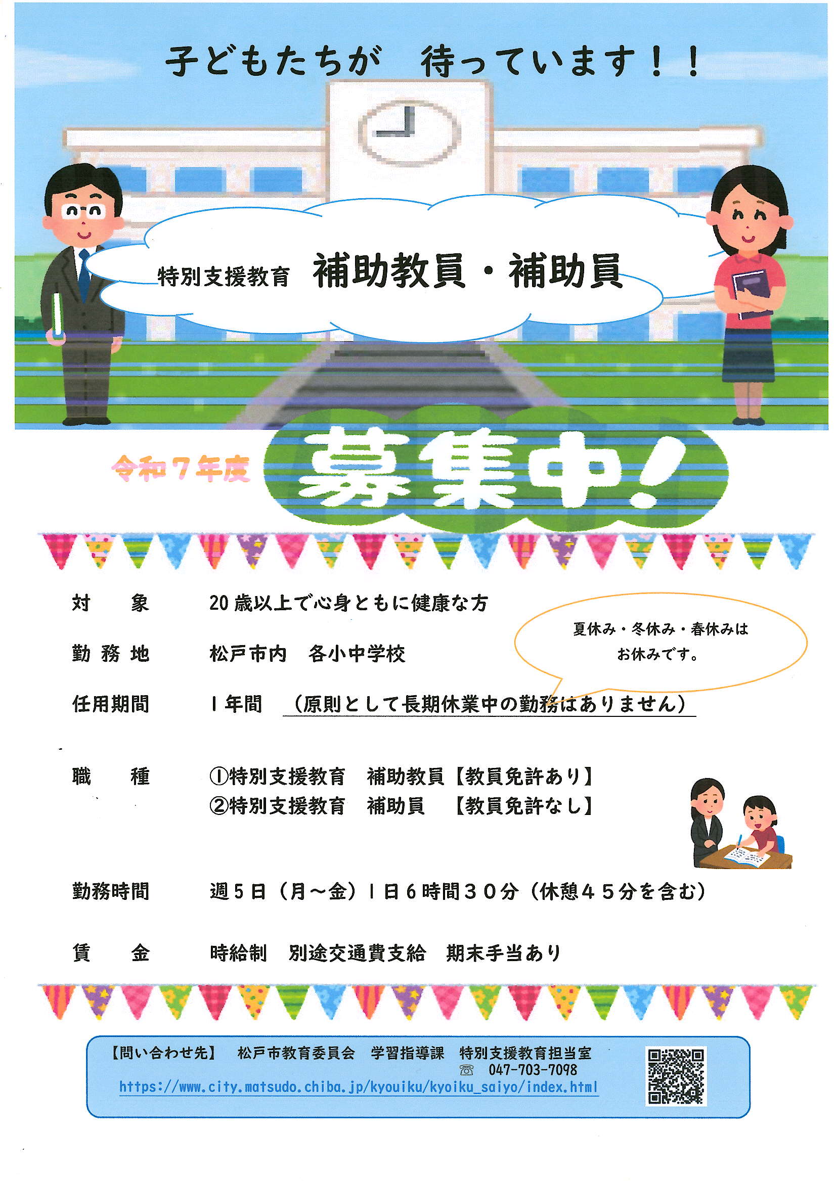 馬橋北小では特別支援教育補助教員・補助員を探しています。詳しくはこちらをクリックして、松戸市のホームページをご覧ください。