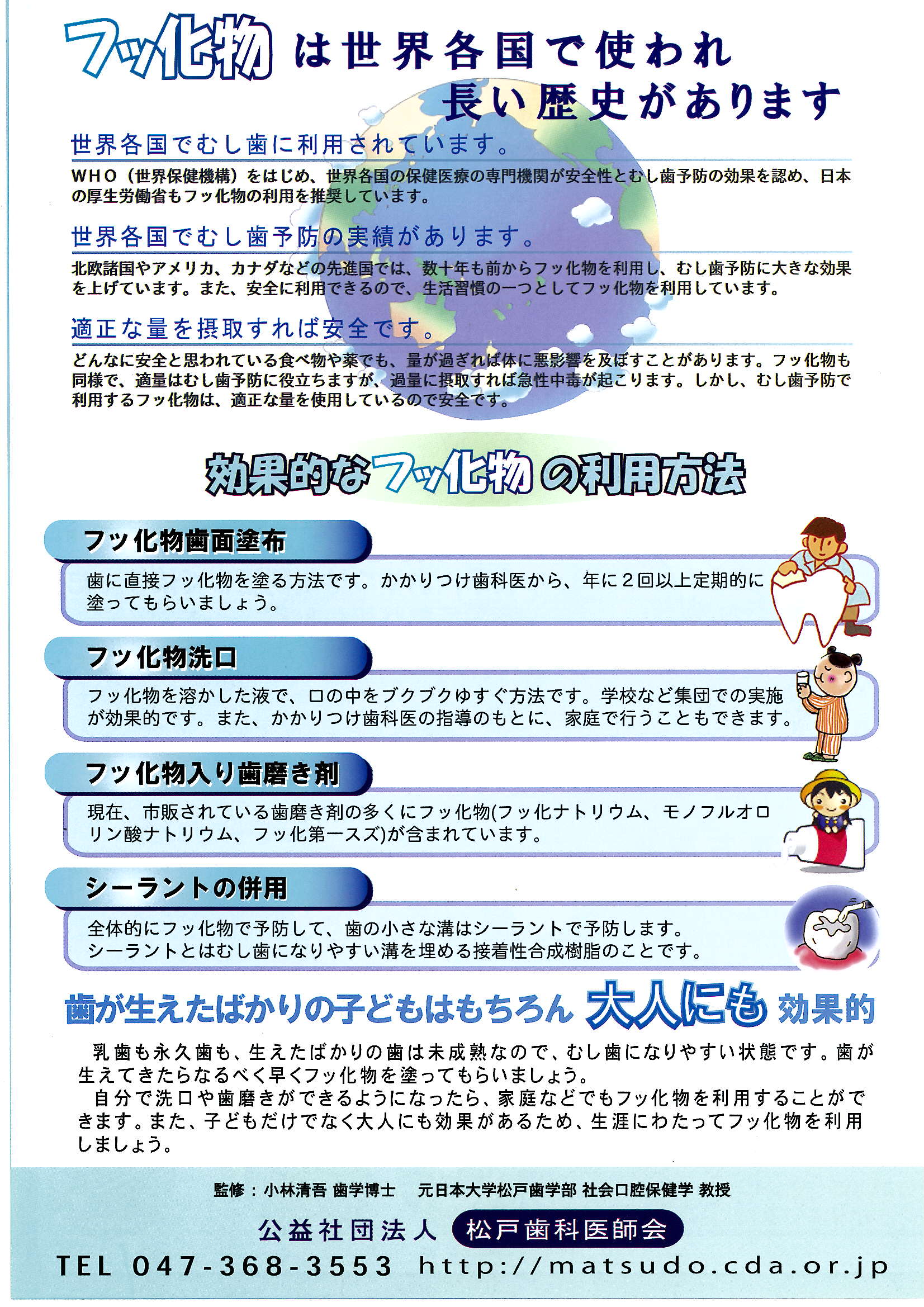 この日は午後から授業参観と保護者会がありました。保護者会の後で、2年生の保護者を対象に、松戸歯科医師会の医師によるフッ化物洗口の講習会が行われました。2年生のうち23人(38%)の方が参加しました。内容は下のパンフレットをご覧ください。