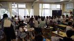 この日はS幼稚園のお子さん約20数名が来校しました。教室で小学校のルールを確認したり、チャイムとともに小学校の生活を体験したりしました。その後で、1年生の教室へ行き、1年生と「こんにちは~」、続いて図書室へ行き図書の先生からルールの話しを聴きました。最後は1階へ降りていき、体育館を見学しました。「楽しかった人~」「はーい」