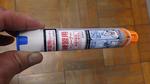 ②握る: オレンジ色の先端(針が出る方)を下にし、グーで握る(親指を先端にかけない)。