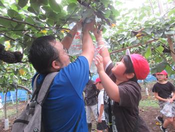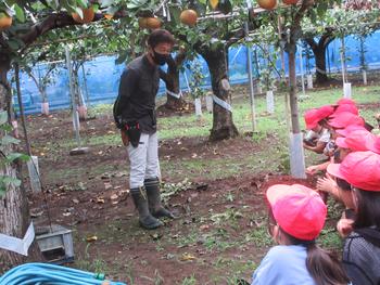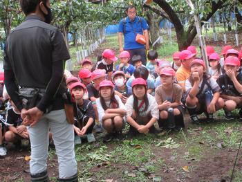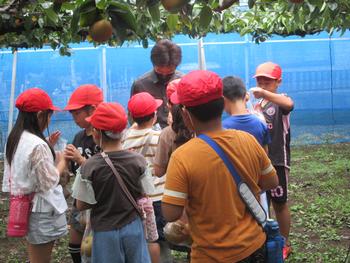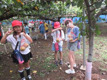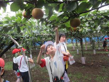 3年生が梨園に行ってきました。梨ができるまでを勉強し、自分で梨もぎ体験をしました。おみやげを持って帰ります。