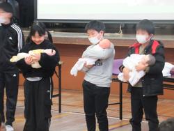 今日は、4年生は総合の学習で、5年生は理科の復習で、松戸市立総合医療センターの助産師さんのお話を聞きました。生まれたばかりの赤ちゃんの体重と同じ人形を抱いてみたり、妊婦体験をしたり、赤ちゃんが生まれる時の様子のお話を聞いたりしました。
