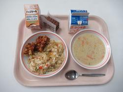 毎日、私たちの元気の源となっている給食が、今日、2学期最終日でした。クリスマスが近いこともあって、今日はスペシャルメニュー!! 「カラフルピラフ」「クリスピーチキン」「コーンポタージュ」「米粉のクリスマスチョコケーキ」「牛乳」です。ケーキは、小麦粉を使っていないので、全員が食べられる配慮で栄養士の先生が用意してくださいました!