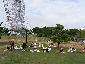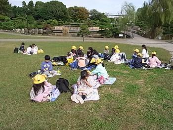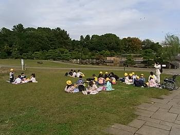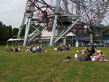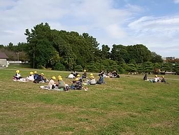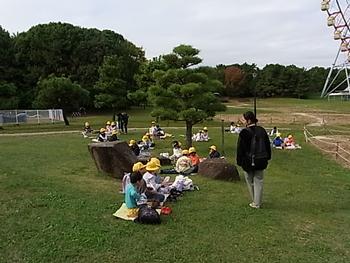 水族園の見学を終え、芝生広場へ移動し、クラスごと、班ごとに分かれて昼食をする子どもたちの様子です。とても広く、あまり他の学校もいなかったこともあり、昼食後にはおやつを美味しそうに食べる子や芝生広場を走り回る子、斜面を転がって遊ぶ子など、楽しい時間を過ごしていました。