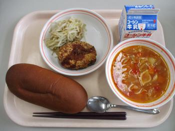 みそしる(じゃがいも):食べやすい大きさにカットされたじゃがいもの他に、油揚げ、わかめ、長ねぎが入り、柔らかく煮えたじゃがいもや油揚げのうま味が良く出ていて、わかめのツルッとした食感、長ねぎのシャキシャキ感を感じることのできる美味しいみそ汁でした。