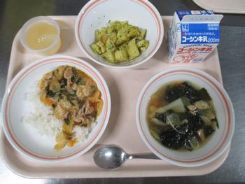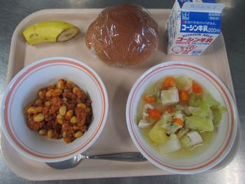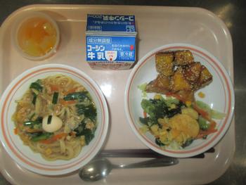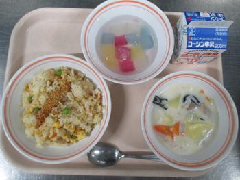 ピーチゼリー:給食室手作りのピーチゼリーはとても爽やかで、ナタデココに桃のうま味がよく染みていて、もっと食べたくなるとても美味しいゼリーでした。