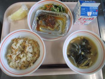 みそしる(いも・ねぎ・わかめ):ダシのうま味にわかめのツルッとした食感が良く、じゃがいもが入ることでボリュームのある美味しい汁物でした。