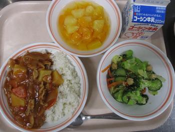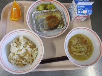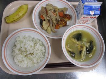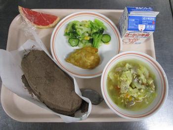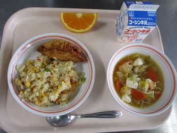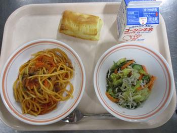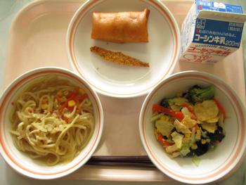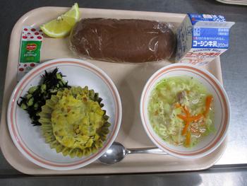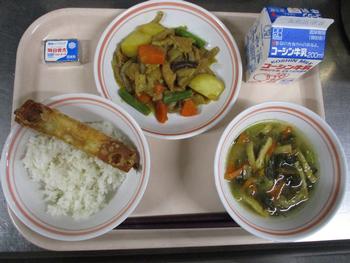 スイートはるまき:給食室手作りのスイート春巻きは、スイートポテトを春巻きの皮で包んであげた感じの一品で、さつまいものうま味やバターの風味がパリッと揚がった春巻きの皮にとても良く合い、もう一つ食べたくなるとても美味しい春巻きでした。