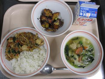 マーボーどん:マーボー豆腐には具がたくさん入りボリュームたっぷりで、給食ならではの一品です。モチモチした豆腐や竹の子の食感が良く、豚肉や干し椎茸のうま味、長ネギやニラの風味が感じられ、ご飯にとても良く合う美味しい仕上がりでした。