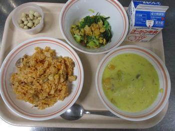 ワンタンスープ:ワンタンスープは小松菜の風味を感じ、ザーサイのうま味も感じられるやさしい味のスープです。給食室手作りのワンタンがとても美味しく、噛むたびにうま味を感じる餡は最高でした。