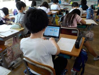 6月18日 今日の1校時、4年生では総合学習で、パンフレット作成に取り組んでいました。学校に関する様々なことをタブレットやインタビューで調べ、まとめていました。1年生と2年生は、国語の学習をしていました。単元最初の感想や、「先生あのね」の作文に取り組んでいました。