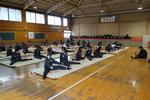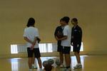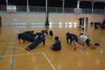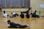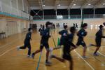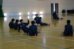 2年生の保健体育では、個別最適なウォーミングアップ、ストレッチ、補強運動を行っていました。音楽をかけて心も体も温め、自分の体力に応じ、自分でメニューを選択していました。 バスケットボール(球技)のチーム練習をリーダー中心に考えて、取り組んでいました。