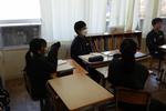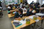 1年生英語の「現在進行形」の単元のまとめスピーキングテストです。「○○をしているところ」の絵を英語の現在進行形で話します。テスト前に友達と確認して練習し合っています。苦手な人もみんなで助け合って、全員が合格できると良いのですが・・・。