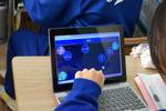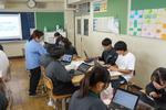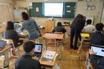 3年生の英語では、teamsの機能「イマーシブリーダー」を使って、会話文を音読していました。発音をAI判定してくれる機能があるので、タブレットPCにむかって何度も練習を繰り返しています。練習の後は、ペアを作って、会話の役になり切って表現を工夫していました。英語を使った活動が豊富にあって楽しく学習していました。