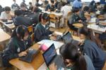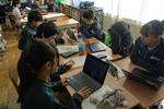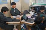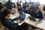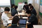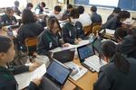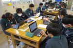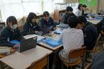 2年生の理科です。それぞれのグループで天気に関わる問いについて調べて、発表プレゼンテーションスライドをまとめています。パワーポイントの操作に戸惑っている生徒もいれば、上手にアドバイスをしている生徒もいて、お互いがよい発表になるように協働的に学習を進めています。