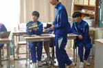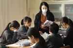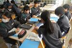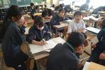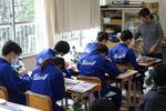 1年生の数学では「図形」の単元で、対称移動について学習していました。グループで教え合い・学び合いが積極的に行われていて、苦手意識がある生徒も気軽にわからないところを聞ける和やかな雰囲気のもと、学習が進められています。