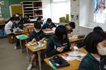 2年生の理科では、次のグループ発表で何をテーマにするかを確認して、教科書をしっかり読み込んで発表内容を見直していました。教科書は最高の参考書です。どの教科も繰り返し読み込むことで学習を深めてもらいたいです。