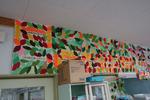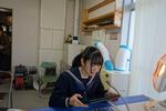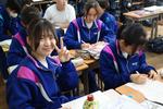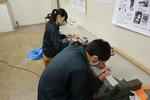 1年生の家庭科では「葉っぱ作り」をしていました。葉脈がきれいに見えるか、自分の名前(イニシャル)がきれいに読めるように縫い付けられているかが評価の対象となっています。玉結び、ボタン付け、お弁当デザイン、それぞれの課題に取り組みながら裁縫の技能が向上していく、成長過程がみえる授業です。過去の先輩たちの「葉っぱ」は被服室にクラスごとに掲示されています。こうやって上手になった先輩たちが各種コンクール等で入賞する結果につながっているのですね。