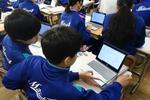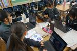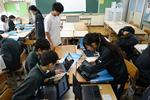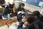 別のクラスでは、グループで選んだ「問い」について、PCや教科書を使って調べて、プレゼンテーション資料を作成していました。グループ内でも調べる内容が違うので、個々に自分の興味・関心に従って探究しています。かなり難しい内容を調べてまとめていることに驚きました。