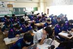 1年生の社会科では、東南アジアのスラム街について学習しています。奥に高層ビル群が見えるスラム街に起きている課題を考えています。たくさん手が挙がって、活発な授業でした。「言われた~」「俺も~」悔しがる生徒もいて、楽しく学習していることが伝わります。