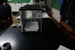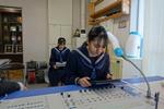 1年生の理科では、レーザー光(赤色光)とガラスを使って、光の屈折の実験・観察をしていました。暗幕を引いて薄暗い中、赤い光とガラスで実験・観察、きれいで不思議、ワクワクしながら取り組んでいます。
