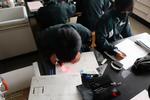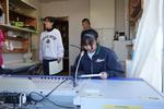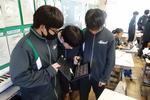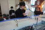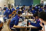 2年生の技術科では「コロックル」というプログラミングを学べる教材づくりで、基板に抵抗やトランジスタをはんだ付けしています。抵抗の種類や向きをしっかりかくにんして慎重にはんだごてで作業しています。