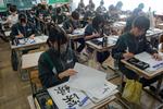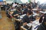 2年生の国語「書写」で、今日は毛筆でした。どちらのクラスも黙々と取り組んでいて静けさの中に緊張感が漂う、心地よい時間になっていました。驚くのは一中生は毛筆が上手な生徒が多いことです。習い事としてやっていた生徒もいると思いますが、そうでない生徒も小学校の授業でしっかりやってきているのだと思います。