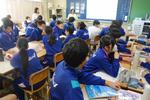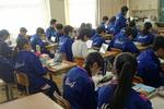 1年生の社会科の風景です。東南アジアの産業が変化してきた理由を資料から読み取る学習です。1980年代は米・野菜・天然ゴム・スズが主な産業だったのが、2010年代は機械類へと大きく変化していること、各国の一人当たりの賃金比較とあわせて、どんな背景があるのかを周囲と友達と考えていました。すでに学習してきたことにヒントが隠されていて、ノートを振り返って気づきを得ている生徒も見られました。