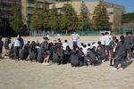 1・2年生ともに保健体育で長距離走に取り組んでいます。4クラスがいっぺんにグラウンドに集まるので、すごい人数です。ウォーミングアップもちょっとした人混みのようです。 今日は2年生の授業に注目してみました。3~4人のグループで学習を進めています。タイムトライアルの結果から、3分間で何m走れるかを分析して、ペースを設定し、スタート位置を決めて(ゴールは同じ)、50mごとの目安であるコーンをそれぞれ何秒で通過したかを学習カードに仲間が記録してくれています。たったの3分間だけ?!と思いましたが、走る側も目的意識を明確にもって、仲間も記録や指示・応援の声が飛び交う内容が濃い学習でした。今日の振り返りに十分な時間があり、前回との走りの違いもしっかり分析できている生徒が多くいました。驚いたのはもう少し動きたいという生徒が半数以上、さらに3分間程度トラックに飛び出ていきました。長距離走というと苦手な生徒が多く、嫌々走らされているイメージも昔の体育にはありましたが、生徒たちが自分たちから走りたがっている姿に、新しい授業の在り方が見られました。