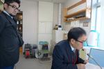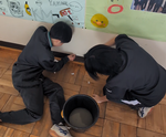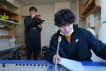 2年生の理科です。雲のできかた、上昇気流、低気圧と高気圧などそれぞれのグループの探求テーマにそった実験を計画して行っていました。丸底フラスコ、少量の水、線香の煙と注射器を使って雲のでき方を実験する班は教科書を参考に計画していたようですが、それ以外にもいろんな実験を調べて、自分たちのやり方で取り組んでいました。
