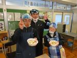 2026年の給食はじめです。今日はお正月メニュー、七草わかめご飯(春の七草)、鰆の西京漬け焼き(春の魚)、キャベツの昆布和え(よろコンブ)、白玉雑煮(祝のかまぼこ入り)、みかん(だいだい:代々栄える)、牛乳でした。みんな笑顔で給食を楽しんでいました。