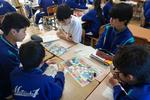 1年生の社会科ではアフリカ州について学んでいました。地図帳を見て、GDP高い国ランキングをグループで予想を立てていました。鉱山や油田などのマークを頼りに、「何が高く売れる?」「金?ダイヤモンド?」活発に意見交換しながら学習していました。