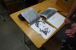 2年生美術の「点描」の様子です。練習も終わり、自分が選んだ題材(人物)をサインペンで点描しています。段々と全容がわかるほどになってきて、表情が現れてきた作品もあります。作業の途中で他の人の作品を鑑賞する時間を設けて、自分の作品の参考にしたりしています。