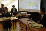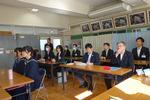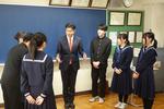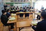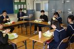 松戸市長が来校し、生徒とのタウンミーティングが開催されました。2・3年生の代表生徒6名と、給食を一緒に食べながら、中学生の「生」の声を聴く企画です。 最初は緊張した雰囲気からスタートし、松戸市長から市の現状についてお話がありました。