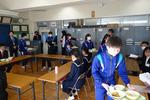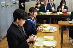 松戸市長のお話が終わった頃にちょうど給食が配膳されました。(3年生の皆さん、ありがとうございました)その後は給食を食べながら和気あいあいと懇談が進みました。今日の給食メニューは、タンドリーチキン、ガーリックピラフ、花豆のポタージュ、ブロッコリーとコーンのサラダ、リンゴ、牛乳です。クリスマスを意識したメニューで、皆さん美味しさに驚いていました。