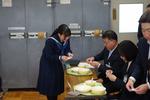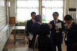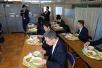 松戸市長、副市長、各部長、課長を給食棟にご案内し、一中の給食について校長先生から説明をしました。900人以上が毎日食べている給食がスムーズに流れるための工夫、施設・調理器具等の制限を受けながらのメニュー等の工夫について知っていただきました。
