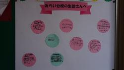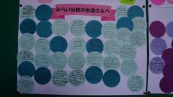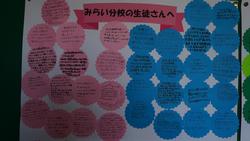 19日に交流会を行った一中の一年生生徒一人一人からのメッセージが届き、廊下に掲示しました。みらい分校のことがよく分かったという内容が多く、スピーチを準備したゲストティーチャーの生徒たちも喜んでいました。 |